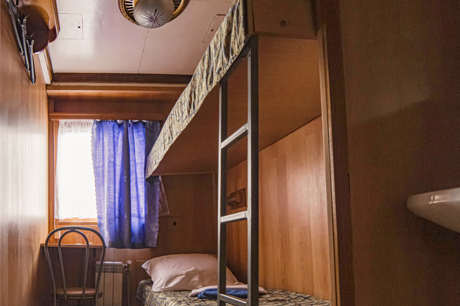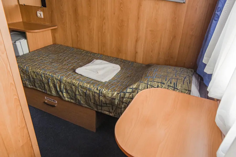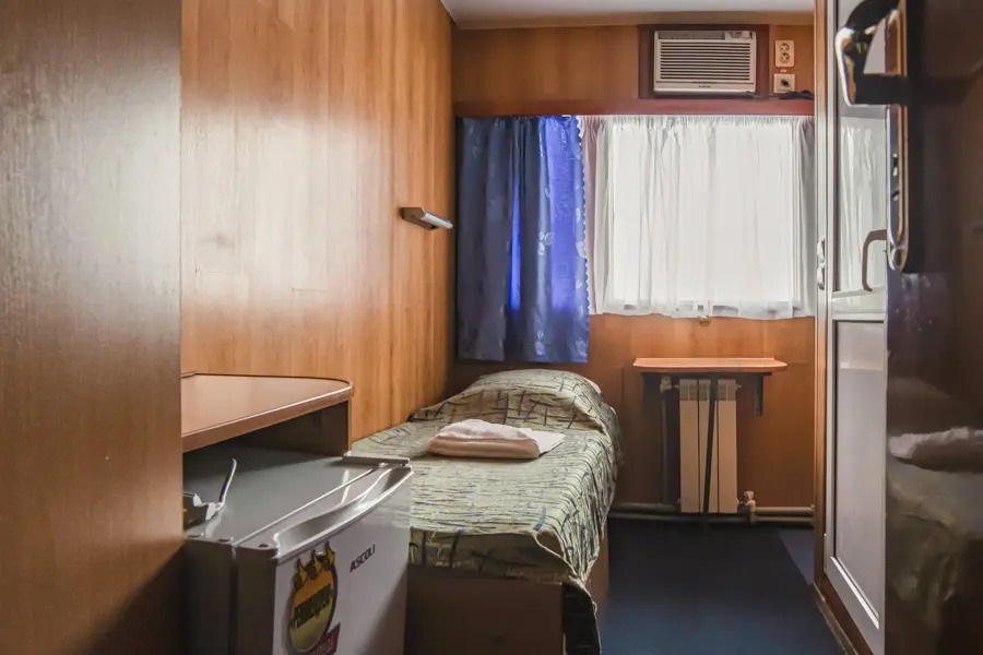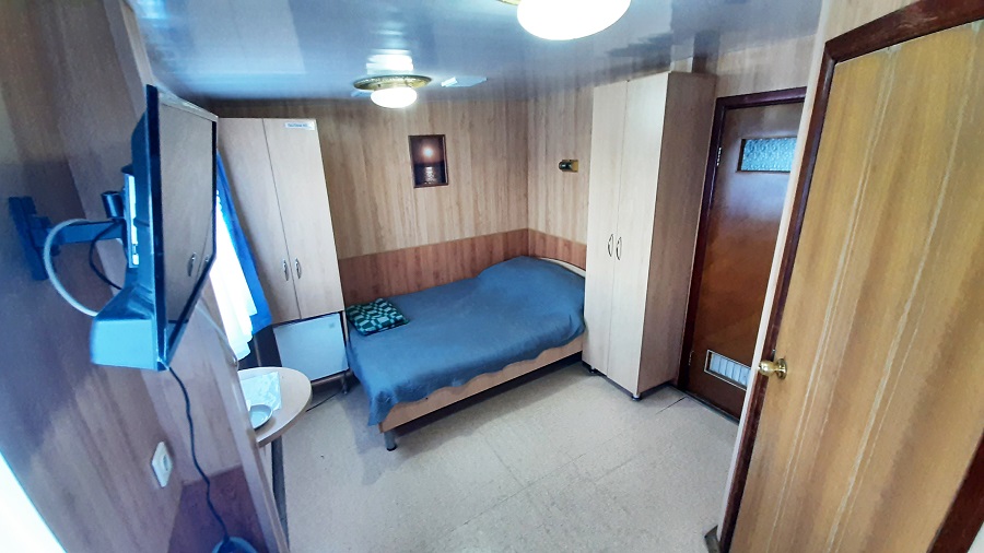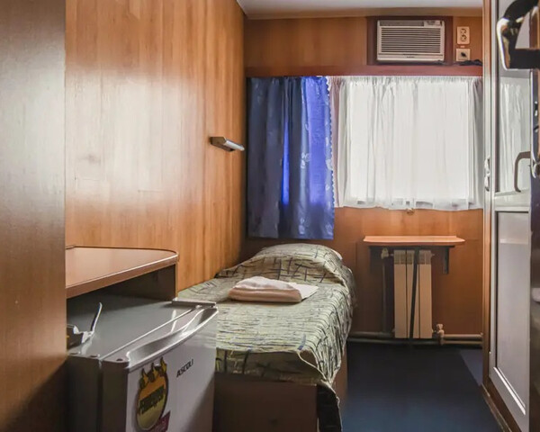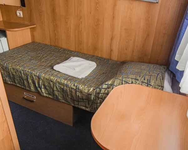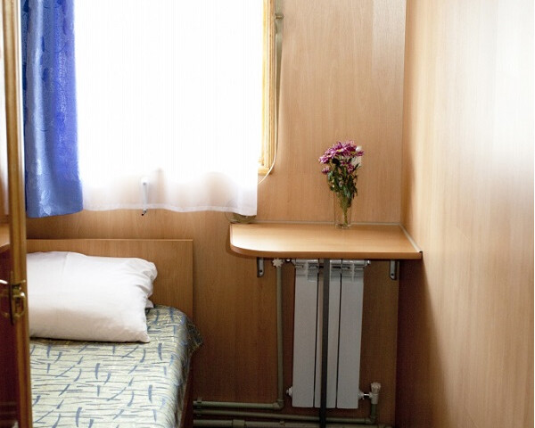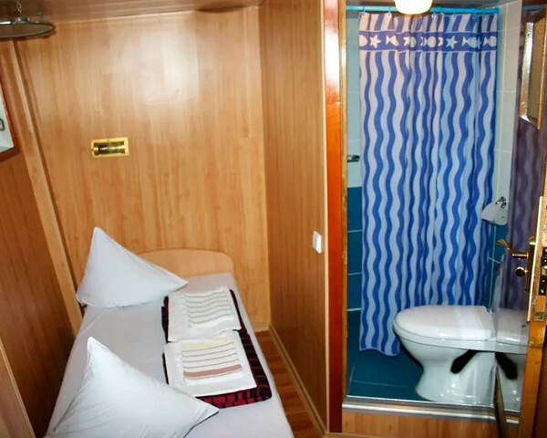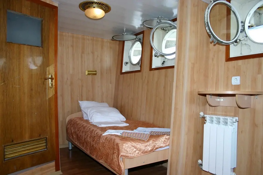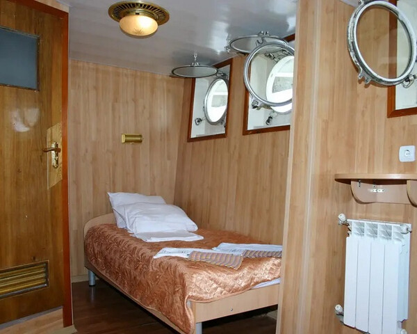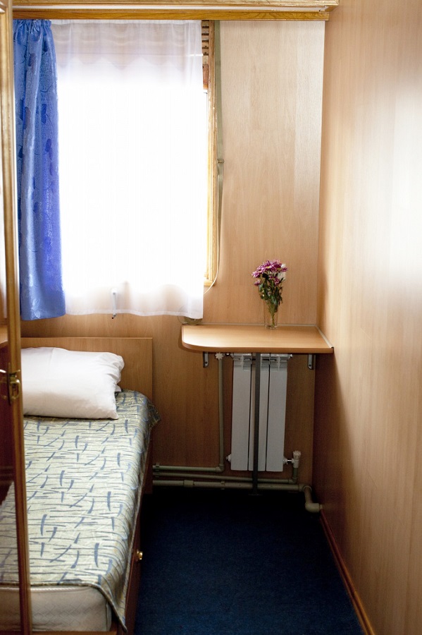 К категории 1 относятся каюты: 301, 302.Одноместная каюта с частичными удобствами, расположенная на средней палубе.Площадь каюты ≈ 5 м².В каюте: односпальная кровать, раковина, шкаф для одежды, стол, радио, розетка 220 V, обзорное окно.