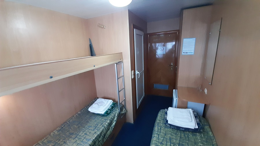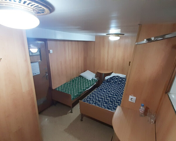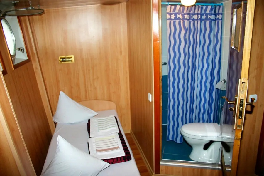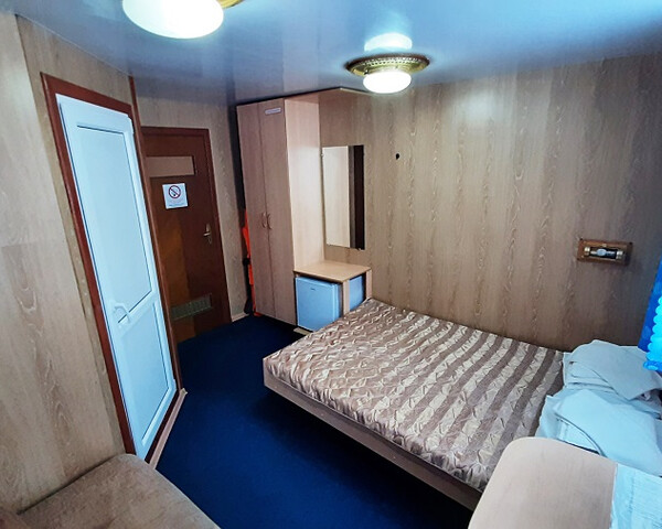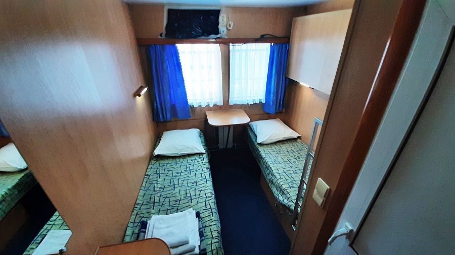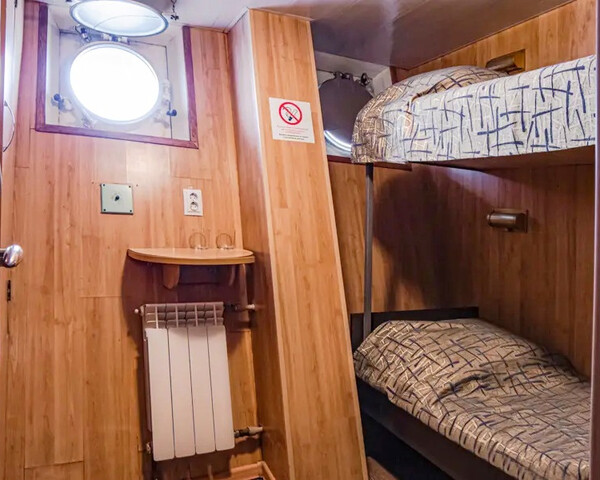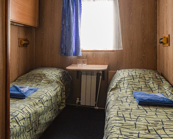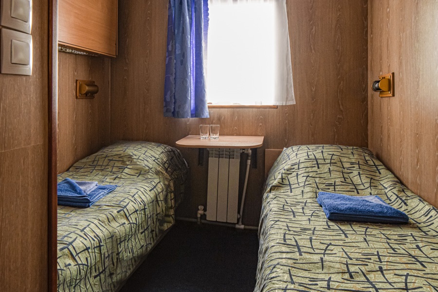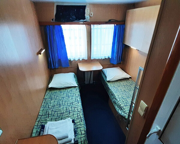 В каюте: двуспальная и односпальная кровати, ванная комната (раковина, душ, туалет), шкаф для одежды, стол, радио, розетка 220V, иллюминаторы.