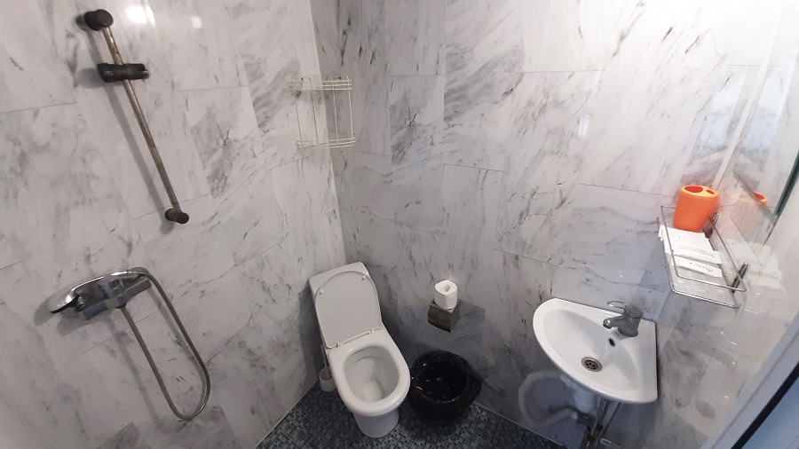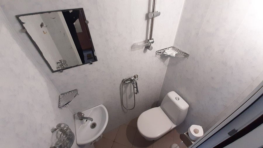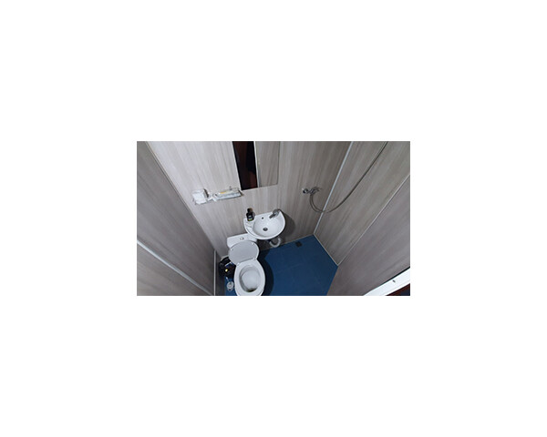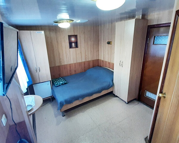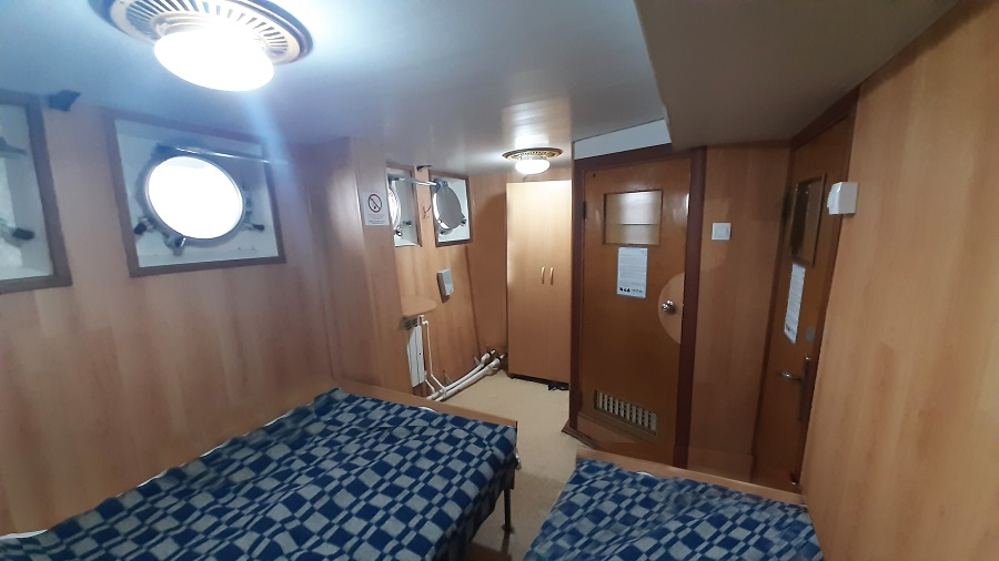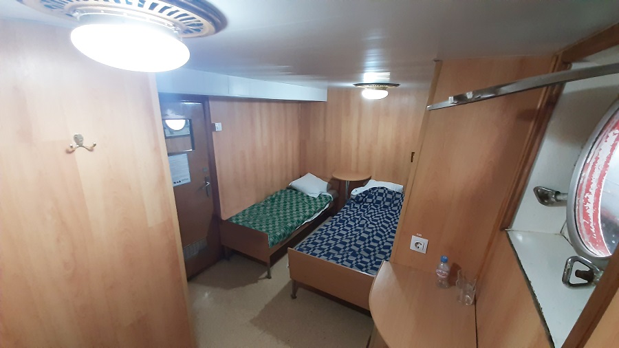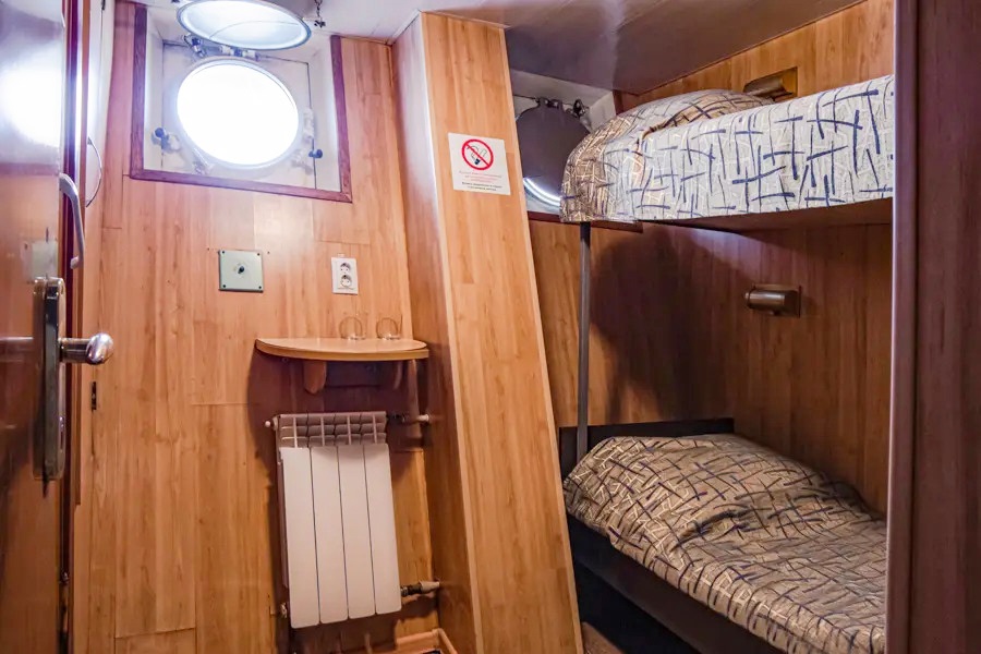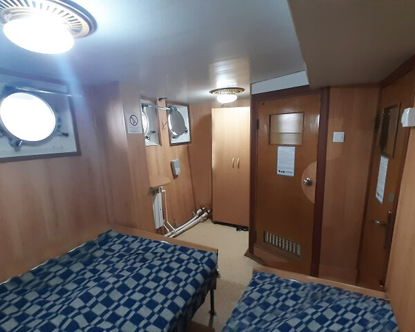 В каюте: двуспальная и односпальная кровати, ванная комната (раковина, душ, туалет), шкаф для одежды, стол, радио, розетка 220V, иллюминаторы.