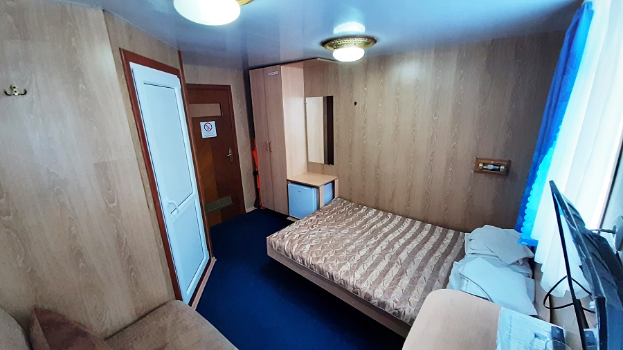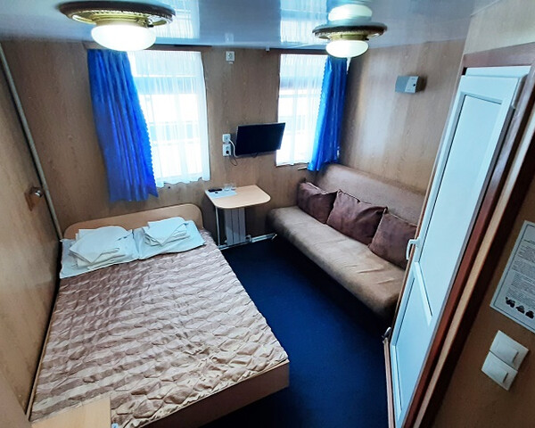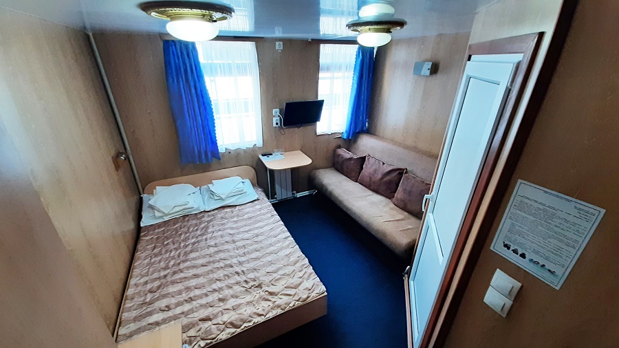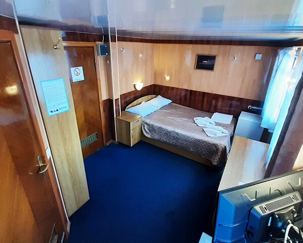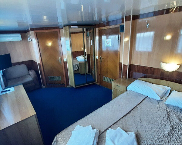 В каюте: двуспальная кровать, диван, ванная комната (раковина, душ, туалет), кондиционер, шкаф для одежды, стол, мини-холодильник, телевизор, радио, розетка 220V, два обзорных окна.