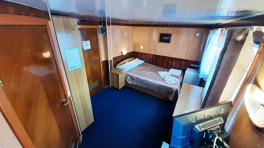 В каюте: двуспальная кровать, кресло-кровать, ванная комната (раковина, душ, туалет), кондиционер, шкаф для одежды, стол, мини-холодильник, телевизор, радио, розетка 220V, два обзорных окна.
