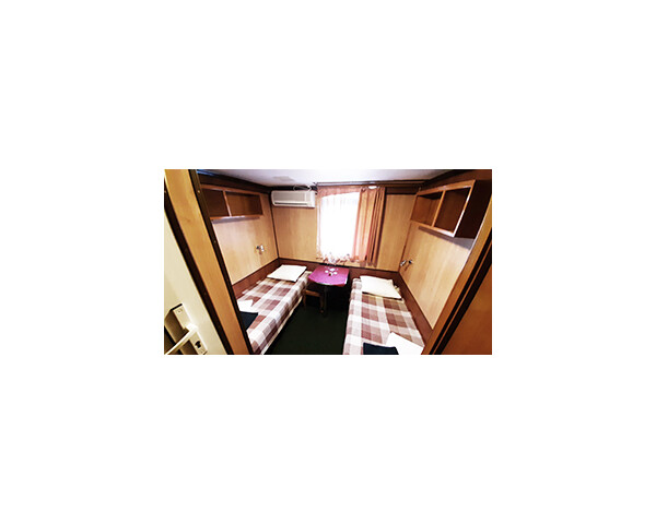 В каюте: две односпальные кровати и одно спальное место верхнего расположения, ванная комната (раковина, душ, туалет), кондиционер, шкаф для одежды, мини-холодильник, радио, розетка 220V, обзорное окно.