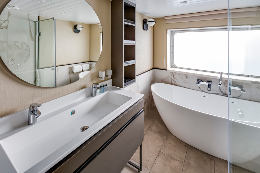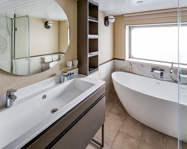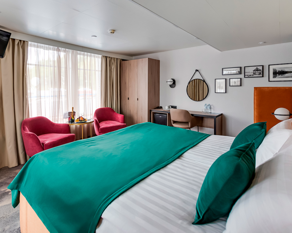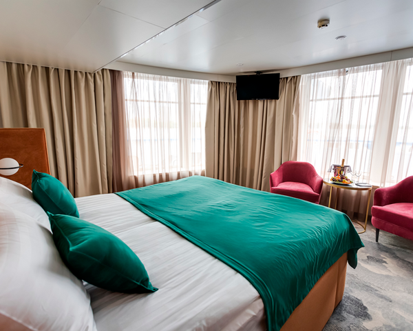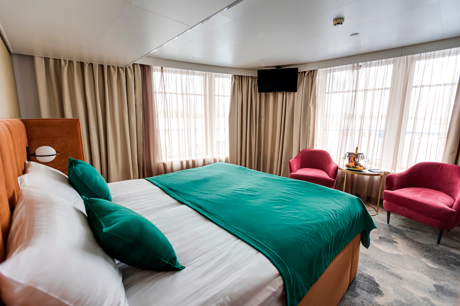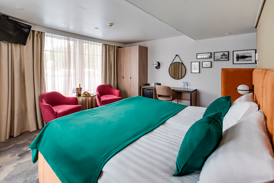 В каюте: двуспальная кровать (можно раздвинуть), кондиционер/обогреватель, телевизор, сейф, внутренний телефон, фен, холодильник, набор посуды (тарелки, вилки, ножи, стаканы для воды, винные бокалы, чайная пара), щетка для одежды, тапочки, халат банный, салфетки в коробке, ручка и блокнот, панорамное остекление.В ванной комнате: душ, зеркало, 2 стакана, туалетные принадлежности (мыло, шампунь, гель для душа, туалетная бумага), комплект полотенец (полотенце банное большое, полотенце для рук среднее, полотенце для ног).