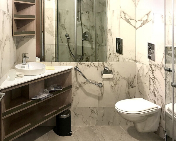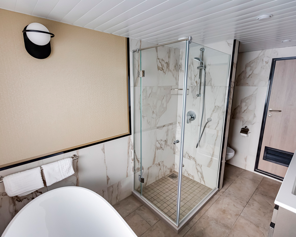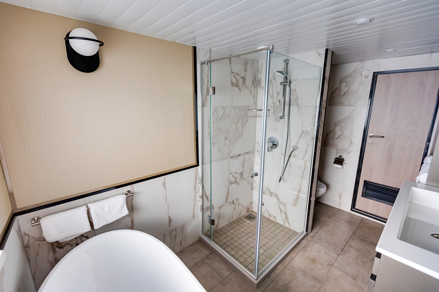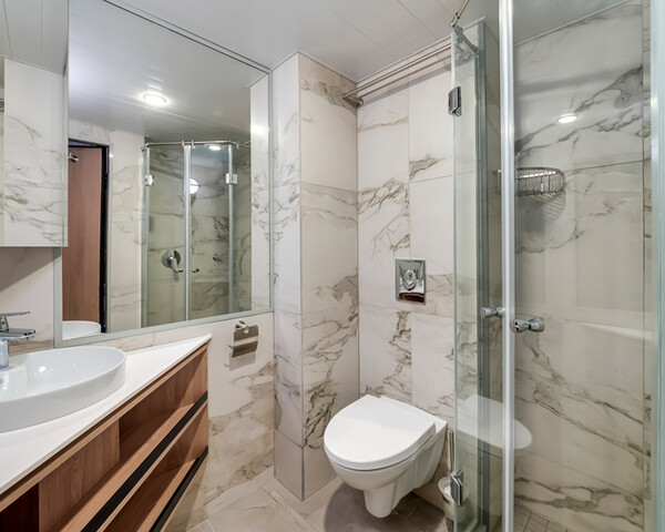 В каюте: двуспальная кровать (можно раздвинуть), кондиционер/обогреватель, телевизор, сейф, внутренний телефон, стеклянные стаканы для питья, фен, холодильник, тапочки, щетка для одежды, панорамный оконно-дверной блок, с выходом на индивидуальный балкон.В ванной комнате: душ, зеркало, 2 стакана, туалетные принадлежности (мыло, шампунь, гель для душа, туалетная бумага), комплект полотенец (полотенце банное большое, полотенце для рук среднее).