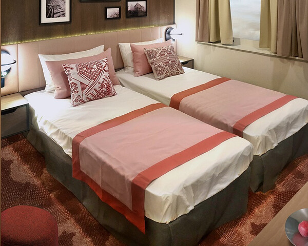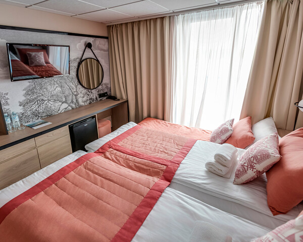 В каюте: двуспальная кровать (можно раздвинуть), кондиционер/обогреватель, телевизор, сейф, внутренний телефон, стеклянные стаканы для питья, фен, холодильник, тапочки, щетка для одежды, обзорное окно.В ванной комнате: душ, зеркало, 2 стакана, туалетные принадлежности (мыло, шампунь, гель для душа, туалетная бумага), комплект полотенец (полотенце банное большое, полотенце для рук среднее).