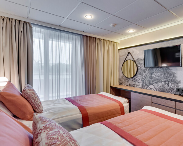 В каюте: двуспальная кровать (можно раздвинуть) кондиционер/обогреватель, телевизор, сейф, внутренний телефон, фен, холодильник, стеклянные стаканы для питья, щетка для одежды, тапочки, панорамный оконно-дверной блок, с выходом на индивидуальный балкон.В ванной комнате: душ, зеркало, 2 стакана, туалетные принадлежности (мыло, шампунь, гель для душа, туалетная бумага), комплект полотенец (полотенце банное большое, полотенце для рук среднее).