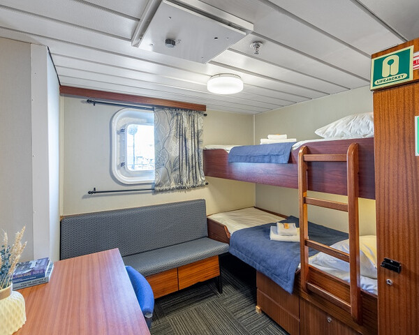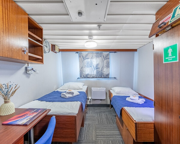 В каюте: две односпальные кровати, раковина, стол, шкаф для одежды, тумбочки, иллюминатор.