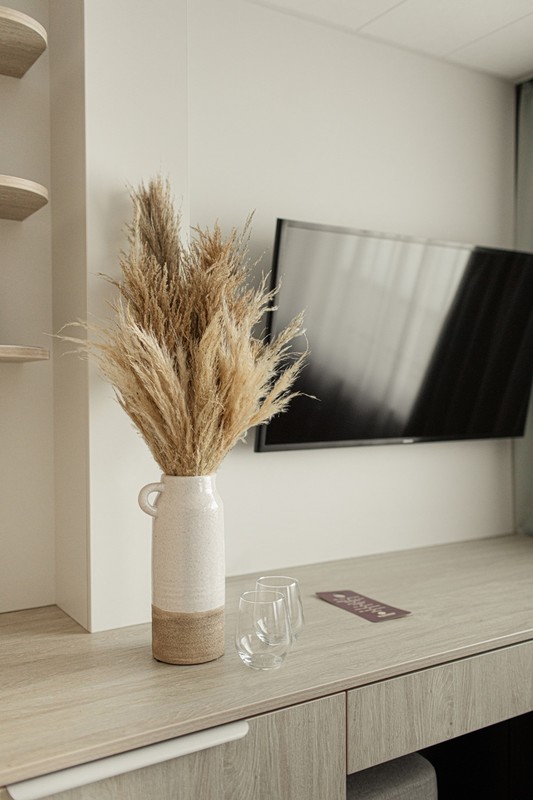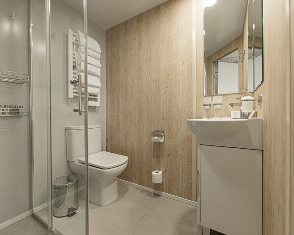 Во всех каютах: шкаф для одежды, радио, телевизор, фен, кондиционер, холодильник, душ, сейф, санузел, обзорное окно (в каютах нижней палубы — иллюминатор), электророзетка 220 V.
