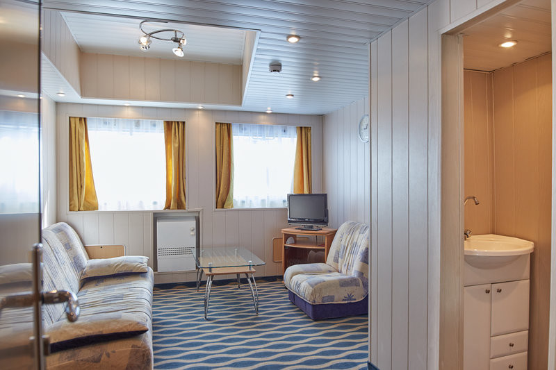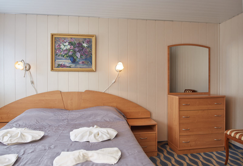 Для размещения туристов предусмотрены 1-, 2- и 3-х местные каюты на шлюпочной, средней, главной и нижней палубах. Имеются каюты повышенной комфортности - люкс и полулюкс. Каждая каюта оснащена дущем, туалетом, умывальником, кондиционером, холодильником, телевизором, внутренней телефонной связью.