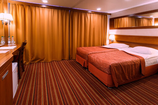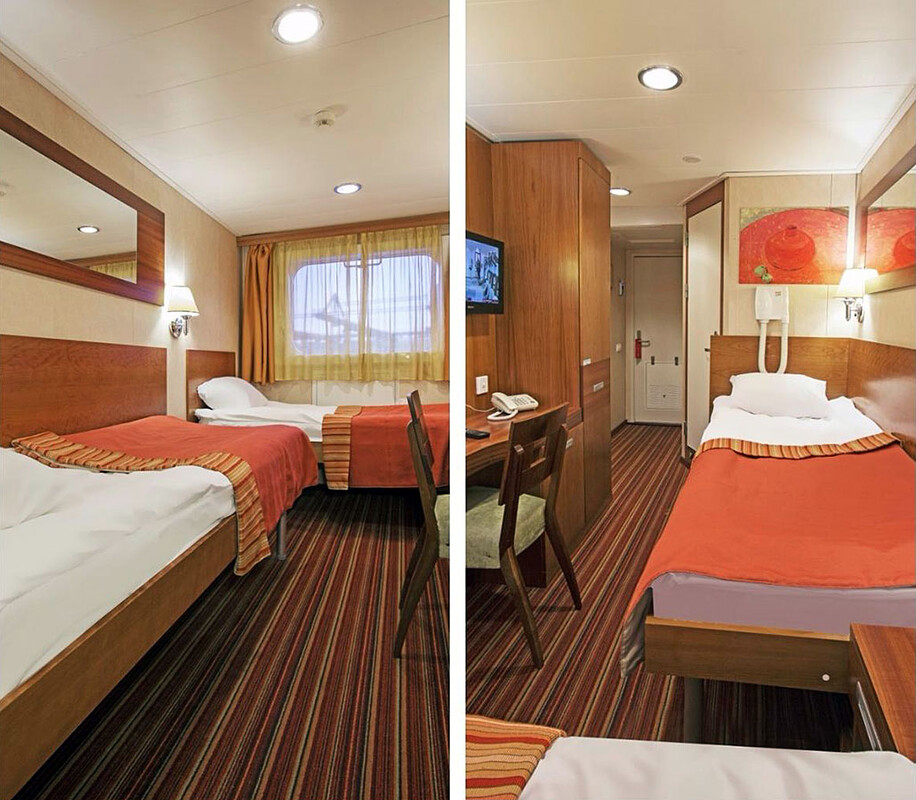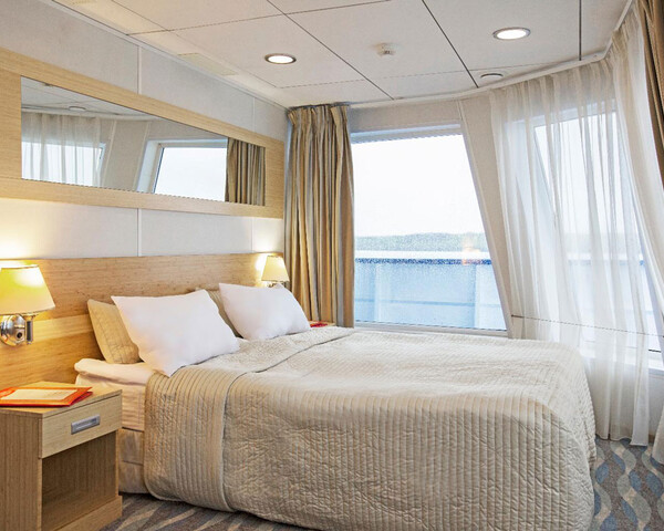 Во всех каютах: шкаф для одежды, кондиционер, телевизор (спутниковое телевидение), сейф, холодильник, фен, радио, телефон, душ, санузел, обзорное окно или балкон, электророзетка 220 V.