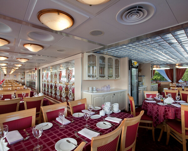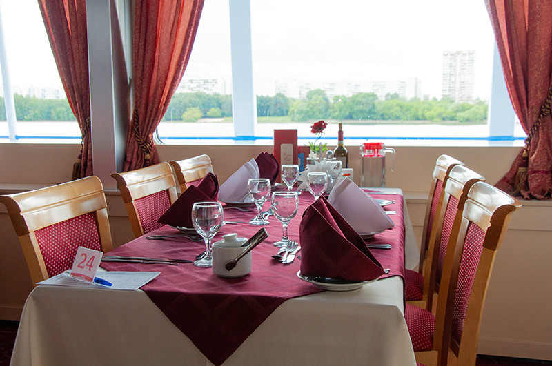 Ужин – заказная система питания (выбор блюд со 2-го дня круиза). Включённые напитки (без ограничения): вода, чай, кофе. На выбор: вино красное / белое / игристое (1 бокал, 125 мл) / водка (1 рюмка, 50 мл) / пиво (1 бокал, 300 мл) / домашний морс (1 бокал, 200 мл). По запросу гостя: кисломолочный напиток (1 стакан, 200 мл).