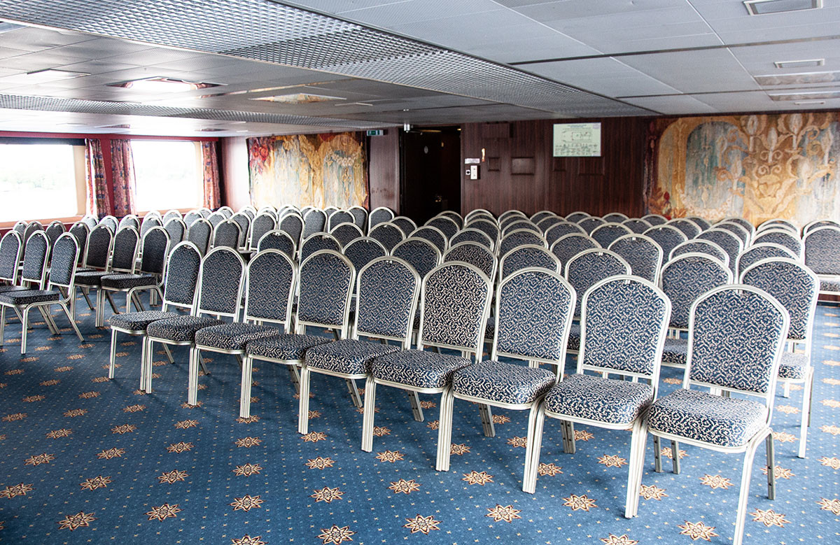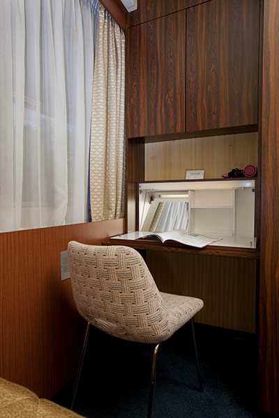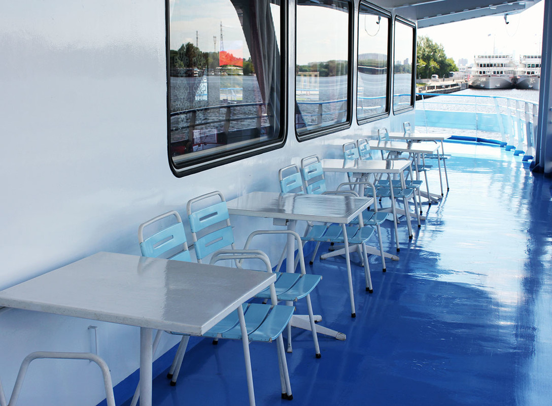 Во всех каютах: шкаф для одежды, кондиционер, телевизор, сейф, холодильник, фен, радио, душ, санузел, обзорное окно, электророзетка 220 V.