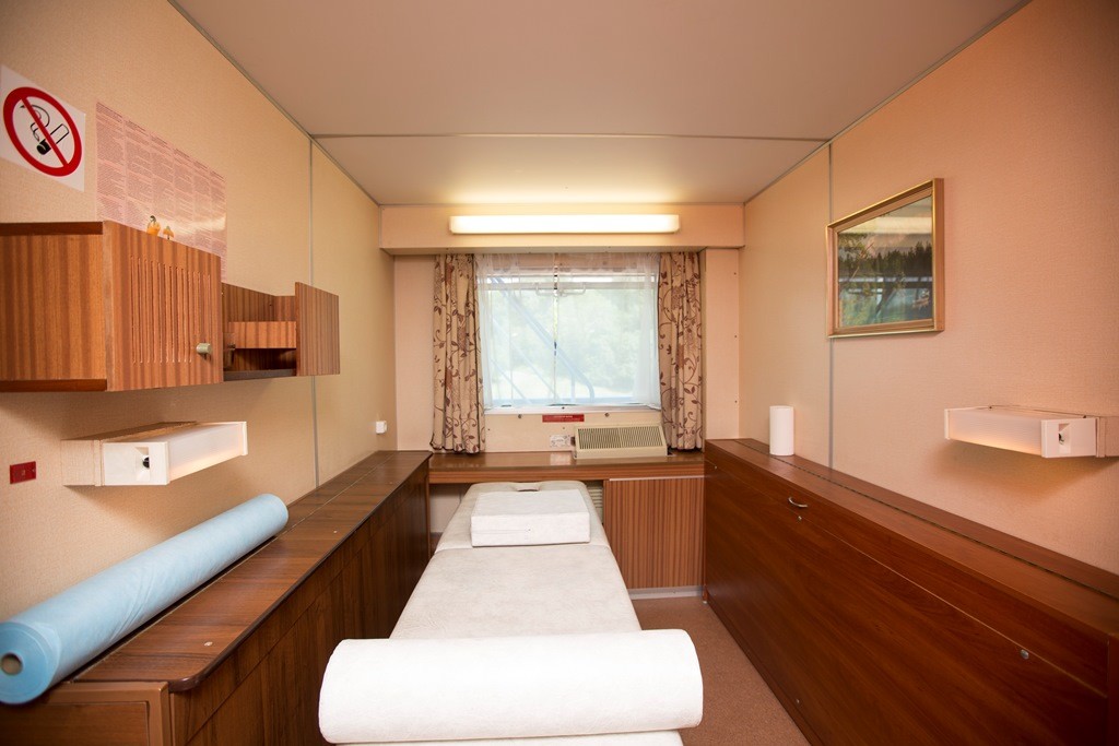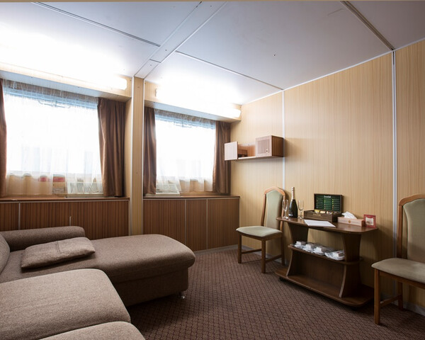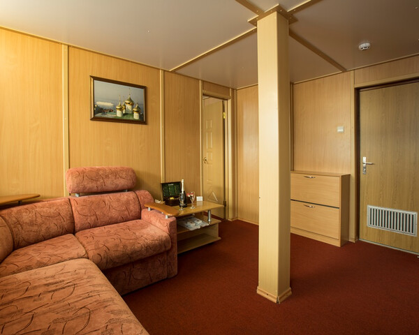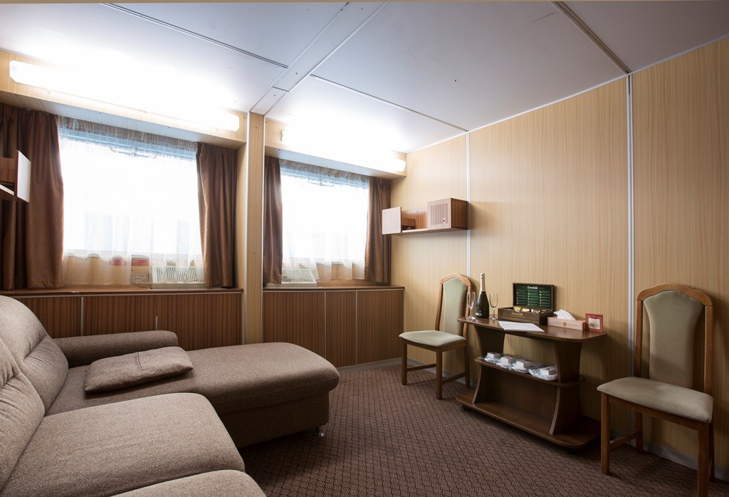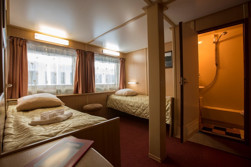 Во всех каютах: шкаф для одежды, радио, кондиционер, душ, санузел, обзорное окно.